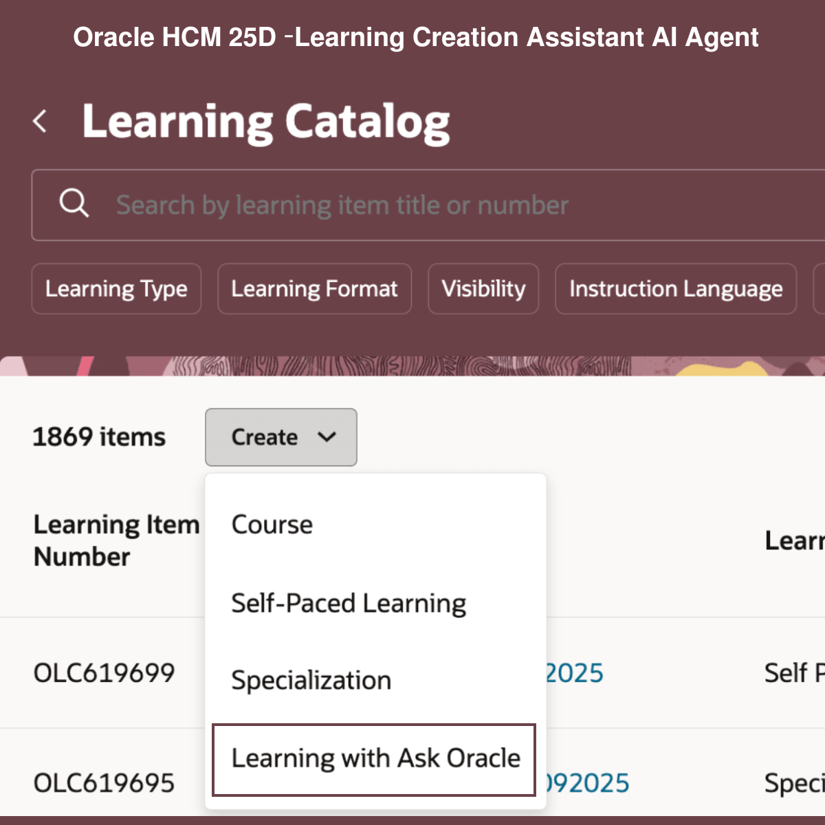 Oracle has rolled out a powerful enhancement in the 25D release – the Learning Creation Assistant AI Agent, bringing Ask Oracle intelligence directly into the Learning Catalog.