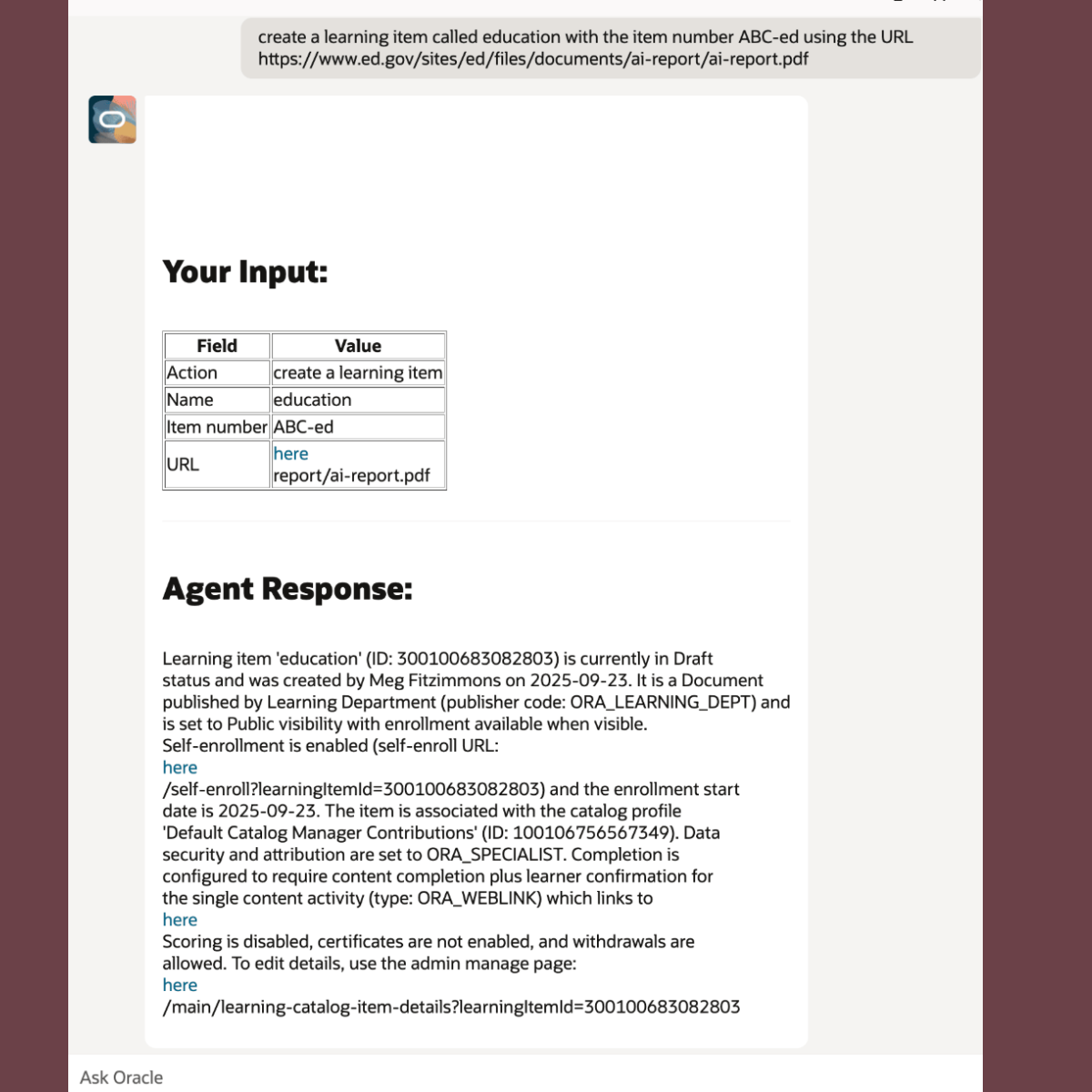๐ Learning Catalog > Create > Learning with Ask Oracle