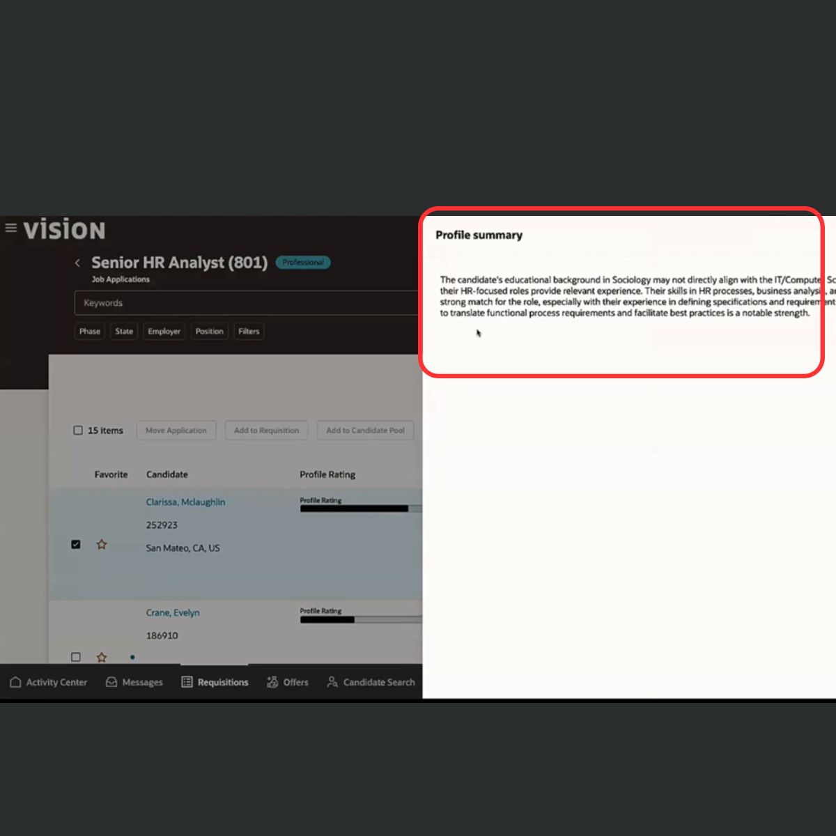 โจย Oracle AI doesnโt just rank applicants. It creates clear, intelligent summaries of each candidateโs experience, strengths, alignment to the role, and areas to probe during screening.